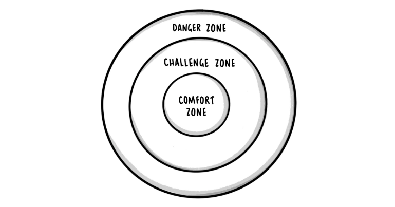 As you can see, it consists of three concentric circles. The smallest circle in the center is our ‘Comfort Zone.’ Beyond that, we have a ‘Learning Zone’ (which is sometimes called our ‘Challenge Zone’) and a ‘Panic Zone’ (or ‘Danger Zone’). The basic idea is to spend as much time as possible in our Challenge Zone without tipping ourselves over into danger. As we repeatedly stretch ourselves in this way, our Comfort Zone expands while our Danger Zone naturally contracts.